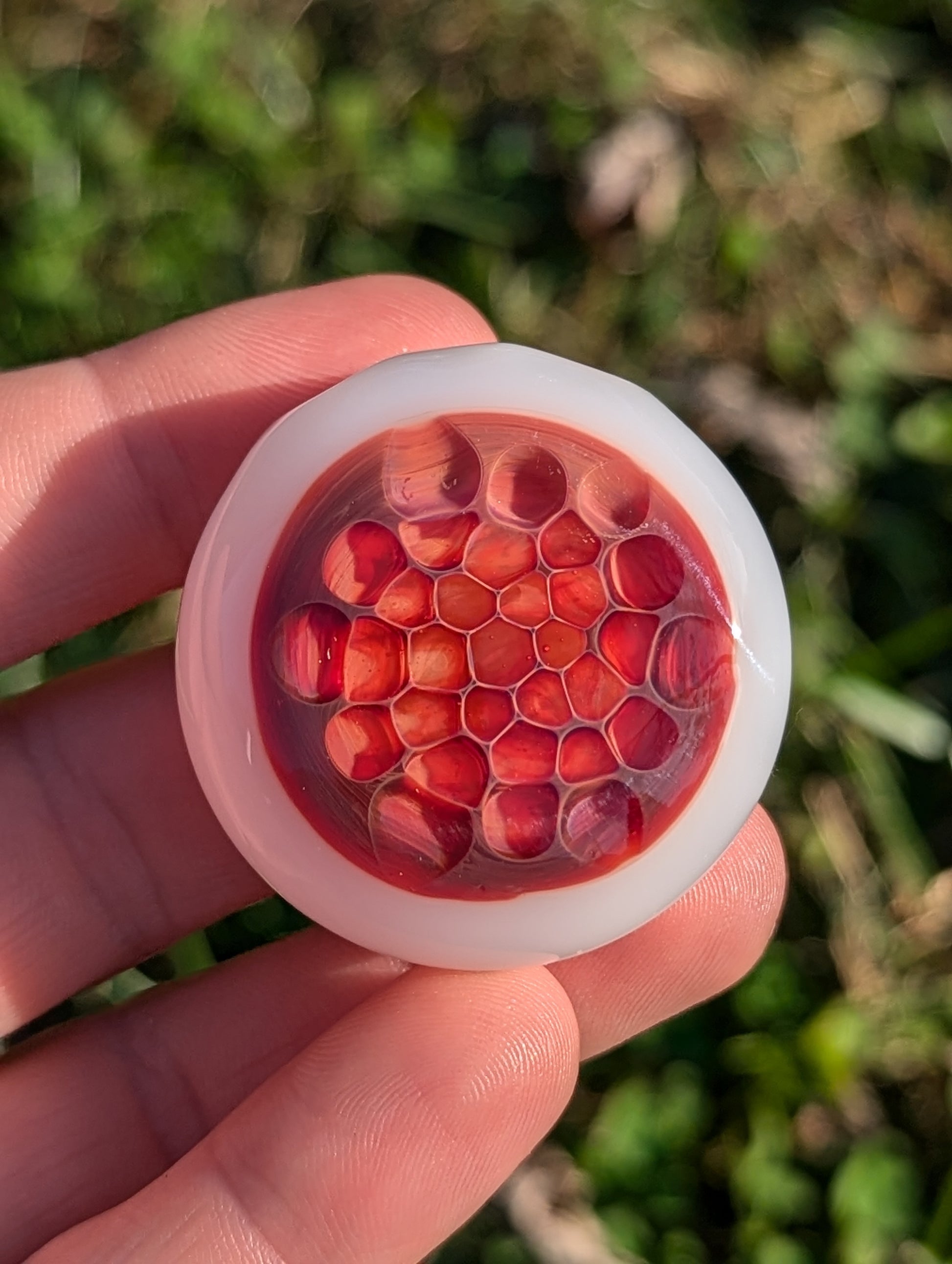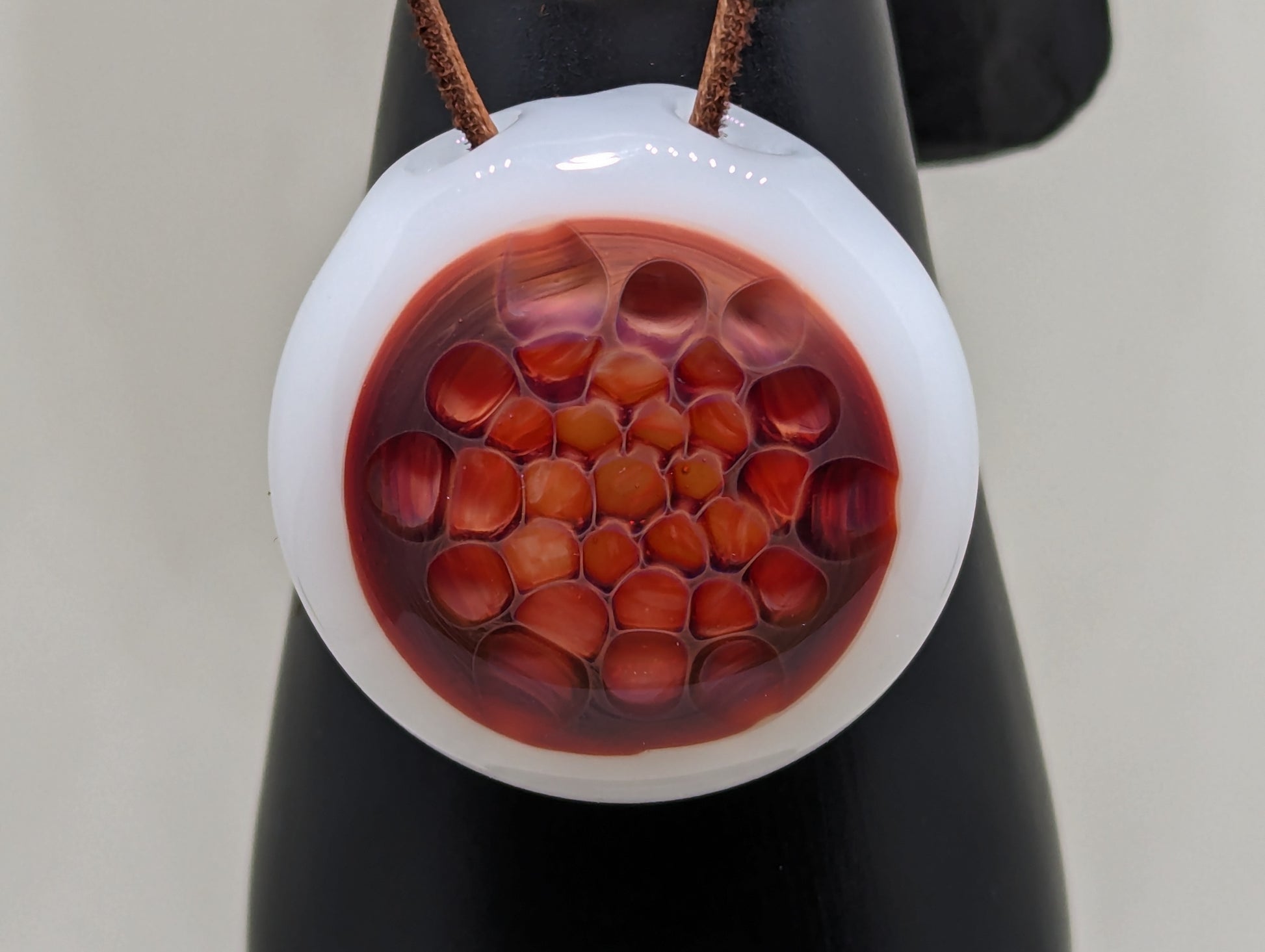 A beautiful Honeycomb Pendant crafted with love out of a single rod of Persimmon Strike Glass Rod